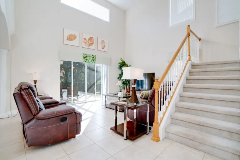 This villa will sleep up to 8 guests and is located in the gated resort of Windsor Palms. Guests staying at Windsor Palms have use of the resort’s facilities which include a clubhouse with a communal pool & Jacuzzi, cinema, fitness centre, games room, kids pool and play area, BBQ & picnic area, tennis courts and tiki bar. Disney is just 3 miles away. The accommodation is on one level and will sleep 8 people. There are 2 double bedrooms, both with an en-suite bathroom and 2 twin bedrooms which share a bathroom. To the right of the entrance to the home is the games room; the hallway leads to a fully equipped kitchen and a living room with a dining area and there is a door to the pool deck. Please note this villa does not have a shaded lanai. The garage has been converted into a games room and features a pool table, basketball nets and a Foosball table. The washer and dryer is also located here. *GATED RESORT WITH COMMUNAL AMENITIES* 2 DOUBLE & 2 TWIN BEDROOMS* Bed Configuration Bedroom 1: King size bed, en-suite shower room, TV Bedroom 2: King size bed, TV Bedroom 3: Twin beds,...