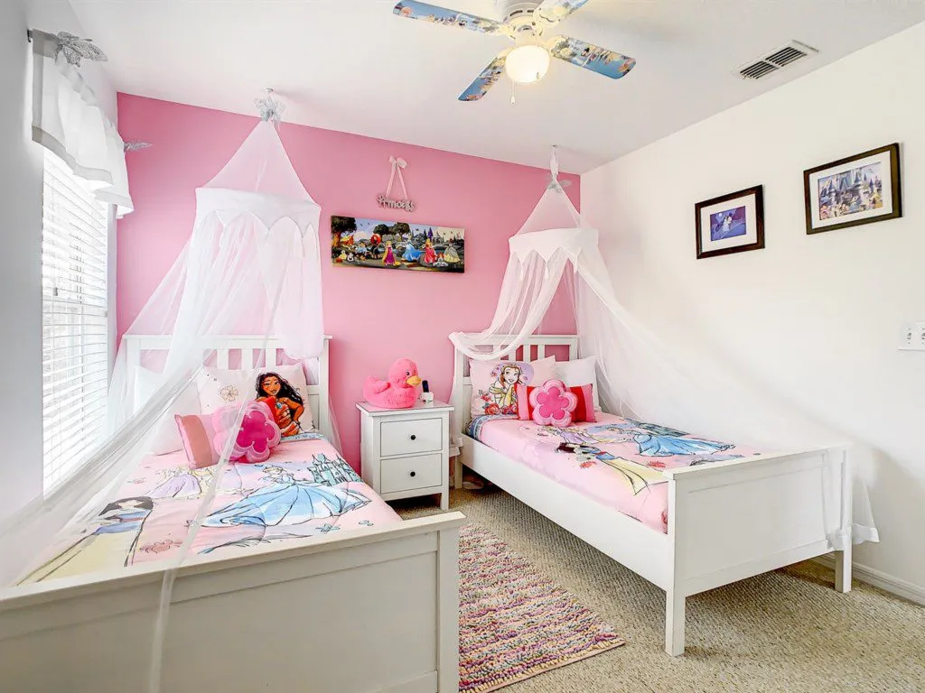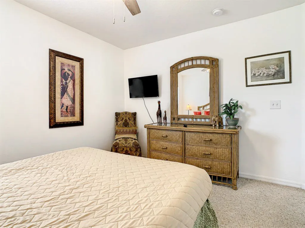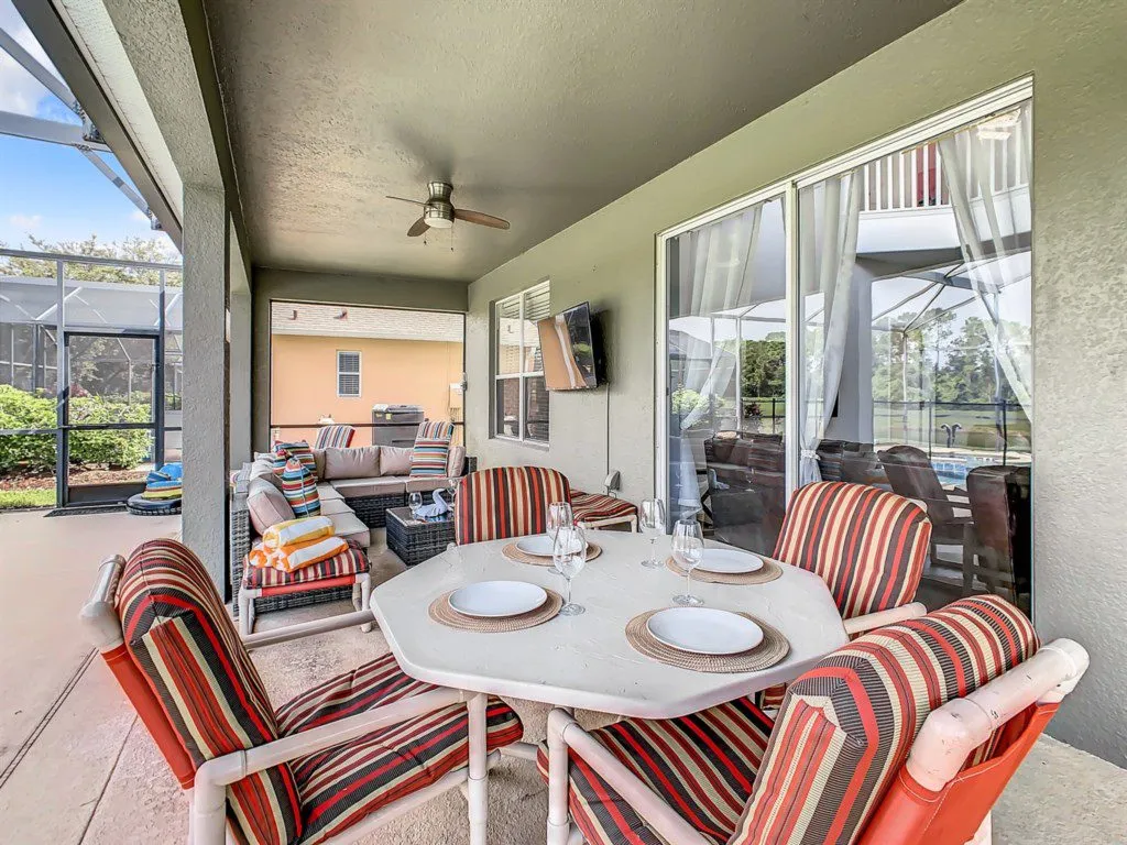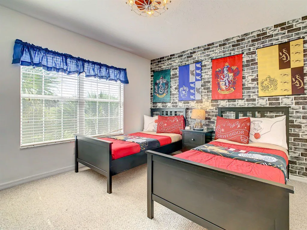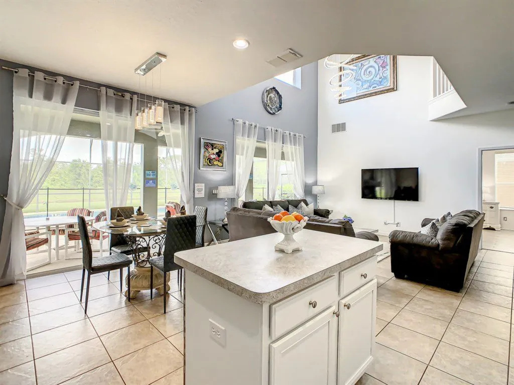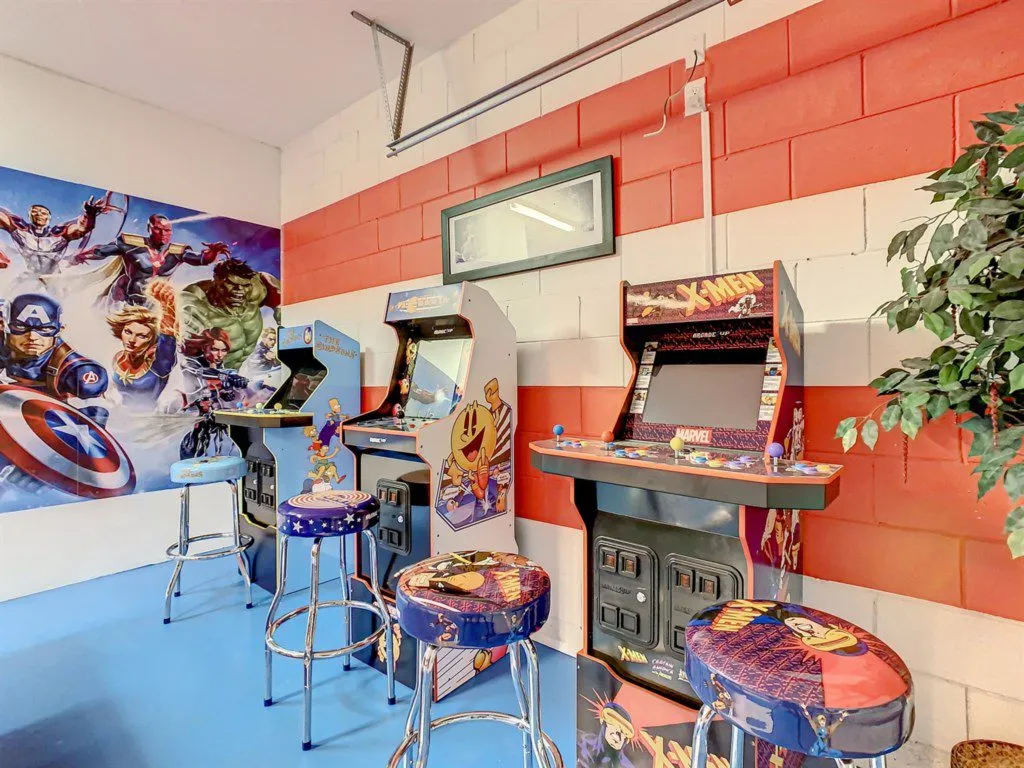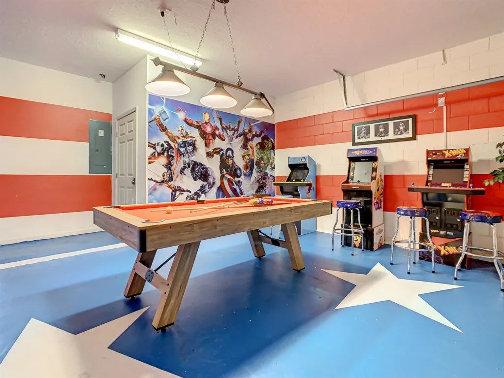 This villa will sleep 14 people and offers complimentary Wi-Fi. Emerald Island is a gated resort just 4 miles to Disney and guests staying here also have use of the communal facilities which include a clubhouse, Tiki bar, heated swimming pool, hot tub, gym, sports courts, walking trails, BBQ area, steam room and 24 hour manned security at the entrance. The accommodation is on two levels and has a master bedroom downstairs. At the entrance of the home is a formal living and dining area and dining. This leads to a fully equipped kitchen and breakfast table with a door to the pool. Opposite is the main living area with comfortable sofas, a wall mounted TV and a dining area with a door to the pool. Off the lounge is a utility room with a washer and dryer. The garage has been converted into a games room complete with air hockey, pool table, and arcade-style decor. The pool deck has no rear neighbours. It features a Spa which can only be heated when pool heated is added. Pool heating is recommended November – April and is an extra charge. The pool deck also has a child safety fence, a shaded lanai...