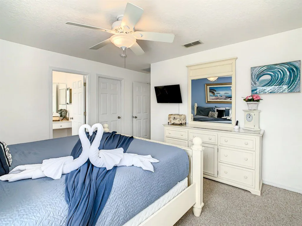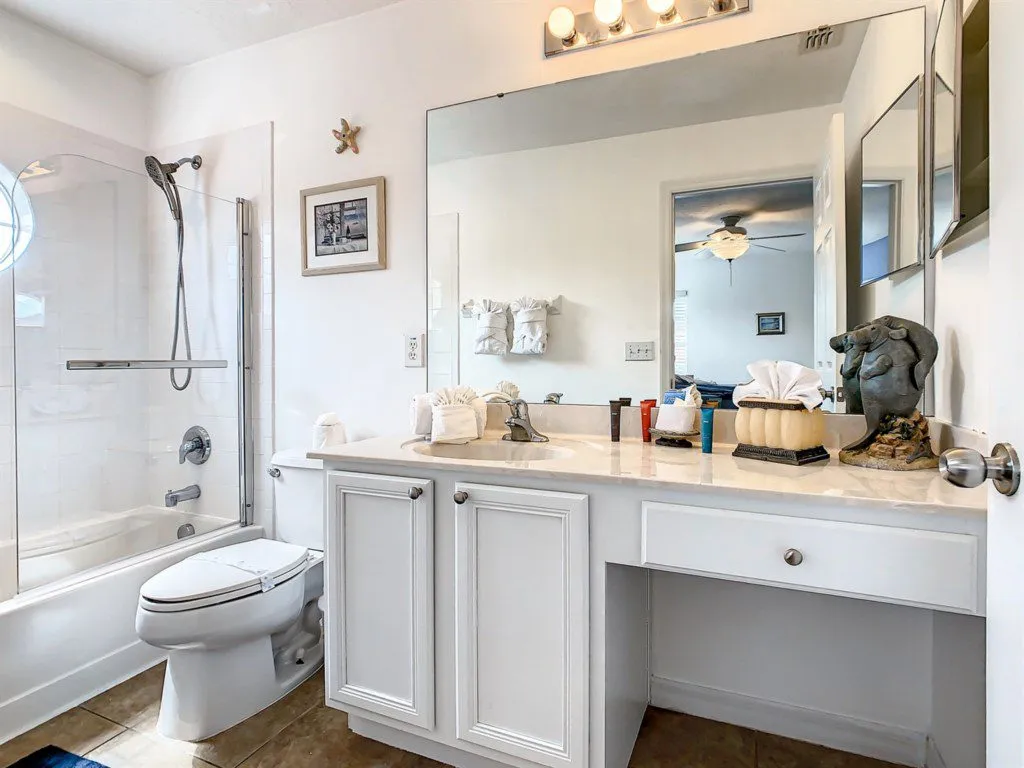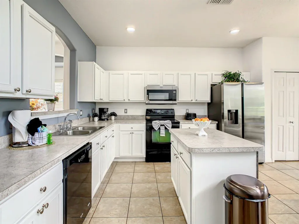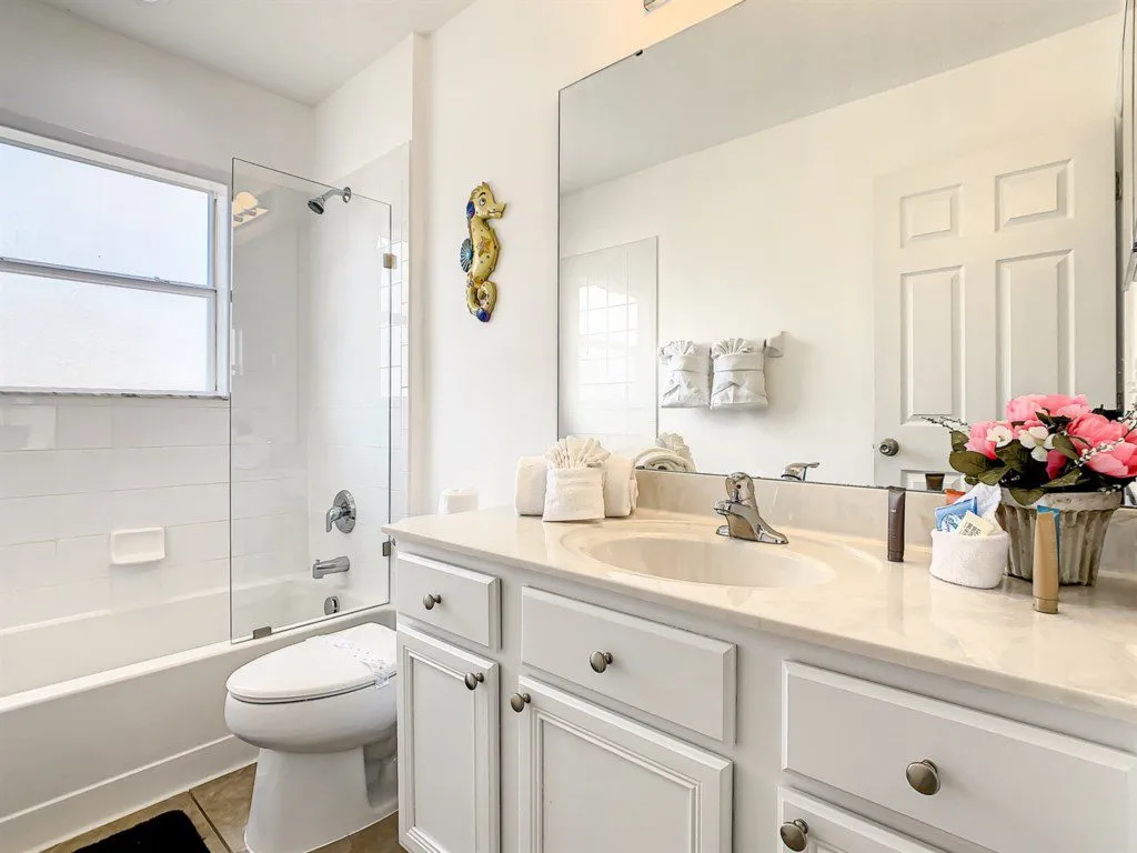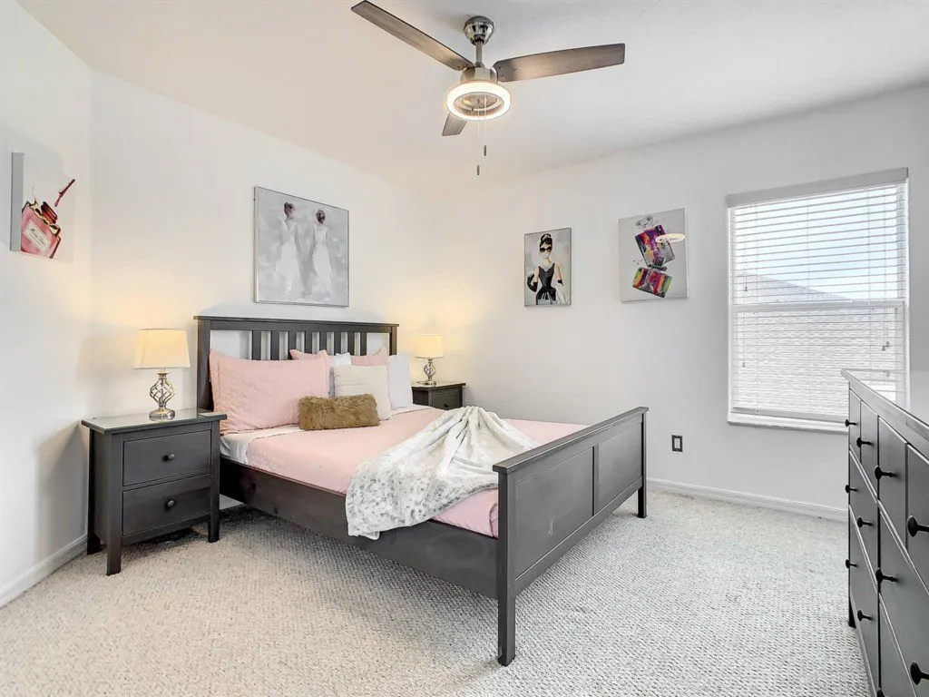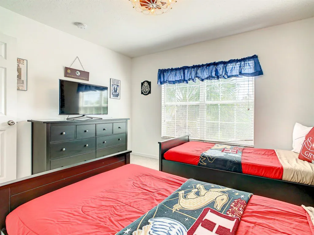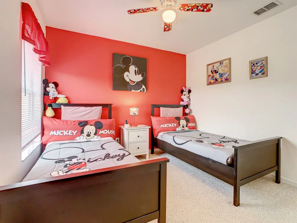 This villa will sleep 14 people and offers complimentary Wi-Fi. Emerald Island is a gated resort just 4 miles to Disney and guests staying here also have use of the communal facilities which include a clubhouse, Tiki bar, heated swimming pool, hot tub, gym, sports courts, walking trails, BBQ area, steam room and 24 hour manned security at the entrance. The accommodation is on two levels and has a master bedroom downstairs. At the entrance of the home is a formal living and dining area and dining. This leads to a fully equipped kitchen and breakfast table with a door to the pool. Opposite is the main living area with comfortable sofas, a wall mounted TV and a dining area with a door to the pool. Off the lounge is a utility room with a washer and dryer. The garage has been converted into a games room complete with air hockey, pool table, and arcade-style decor. The pool deck has no rear neighbours. It features a Spa which can only be heated when pool heated is added. Pool heating is recommended November – April and is an extra charge. The pool deck also has a child safety fence, a shaded lanai...