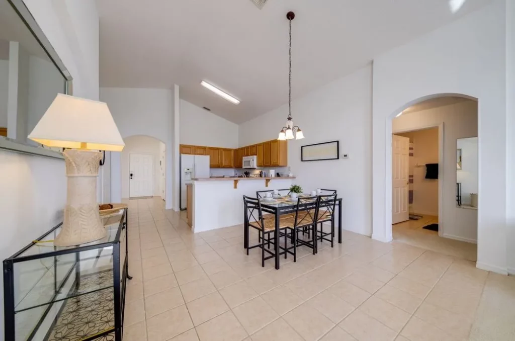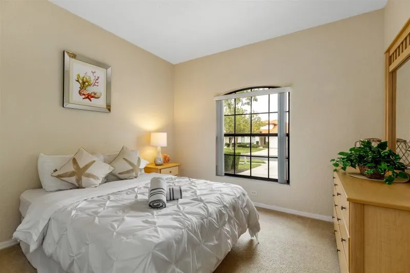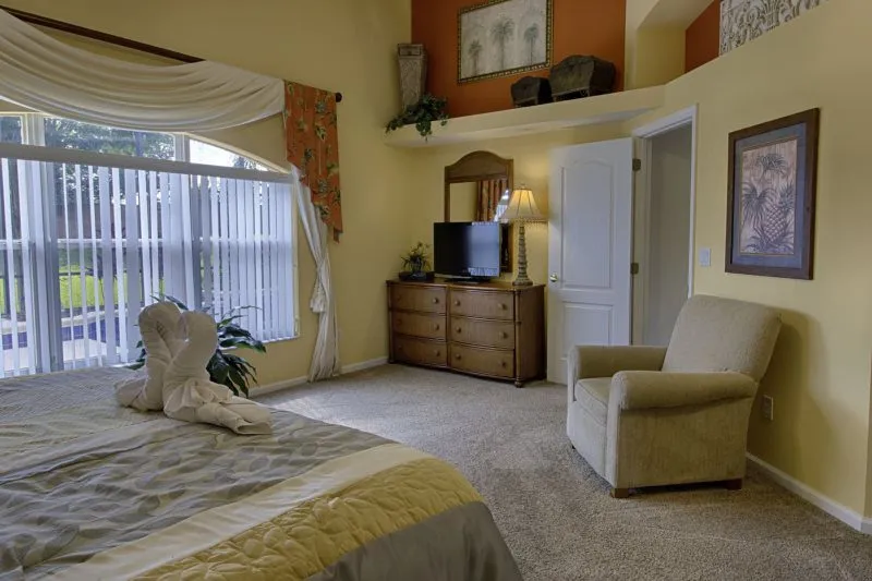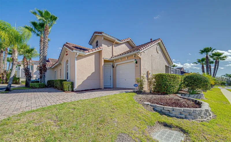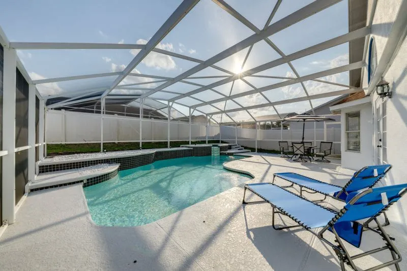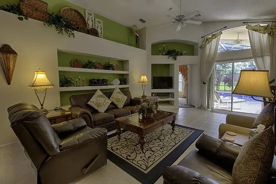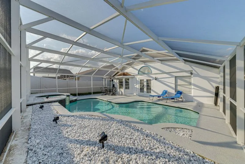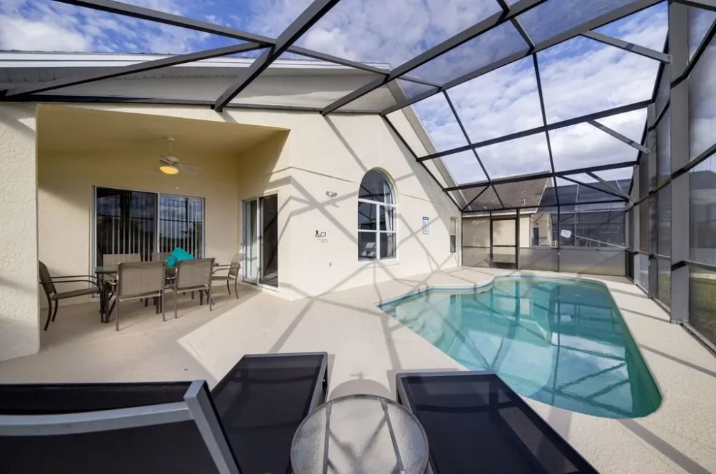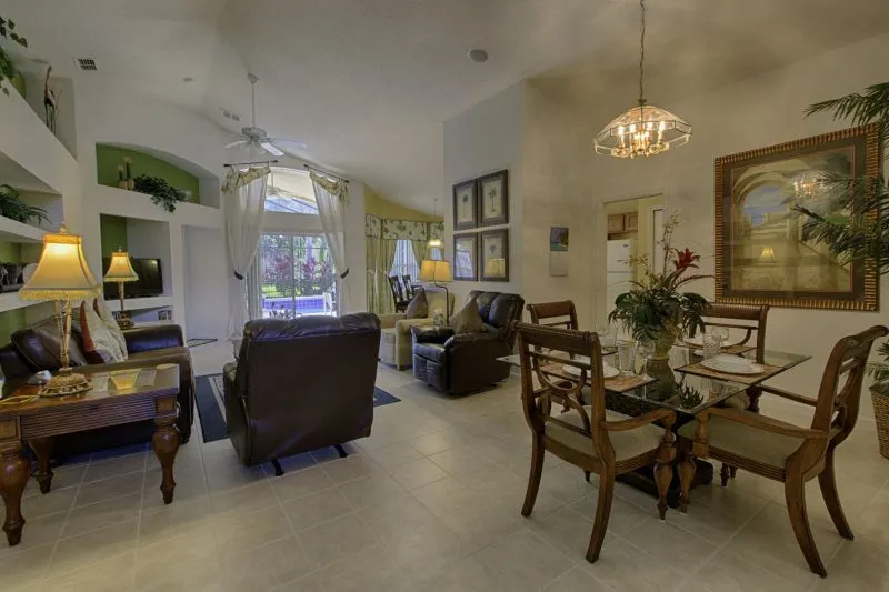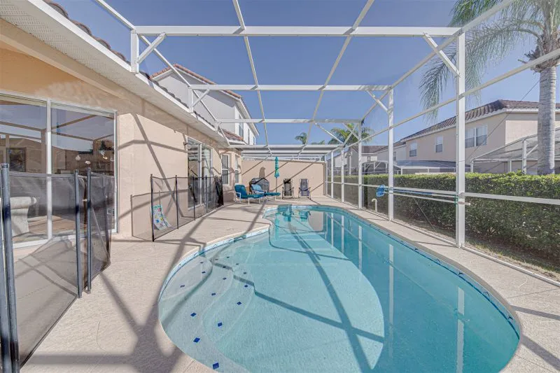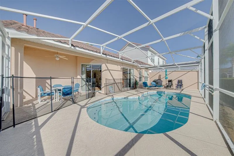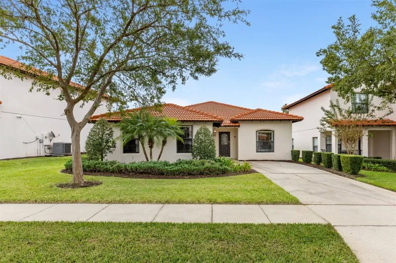 This Mediterranean-style villa is located in the gated community of Tuscan Hills, Davenport, which also has on-site facilities including a clubhouse, gym, games room, childrens’ play area and tennis and volleyball courts. The accommodation is one one level and is tiled throughout. There are 3 bedrooms, one king bed with en-suite bathroom, one queen and one twin. Each bedroom has its own flat screen TV.The entrance opens to an open plan floor space with a lounge and dining area, both of which have a door to the pool deck. There is a fully equipped kitchen and a utility cupboard with a washer and dryer. Complimentary Wi-Fi is provided. The pool is quite secluded as there are privacy hedges either side. A BBQ is available for a fee and there is a pool safety fence. Bed Configuration Bedroom 1: King size bed, TV, en-suite shower room Bedroom 2: Queen size bed, TV Bedroom 3: Twin beds, TV Family bathroom More Information There is an additional optional charge to heat the pool.