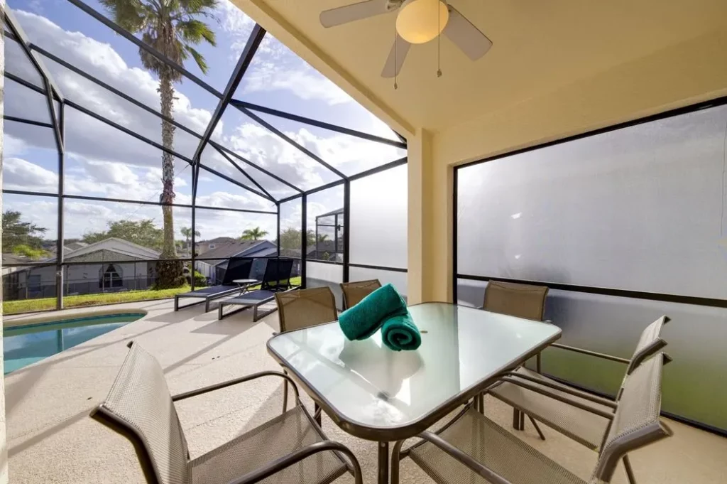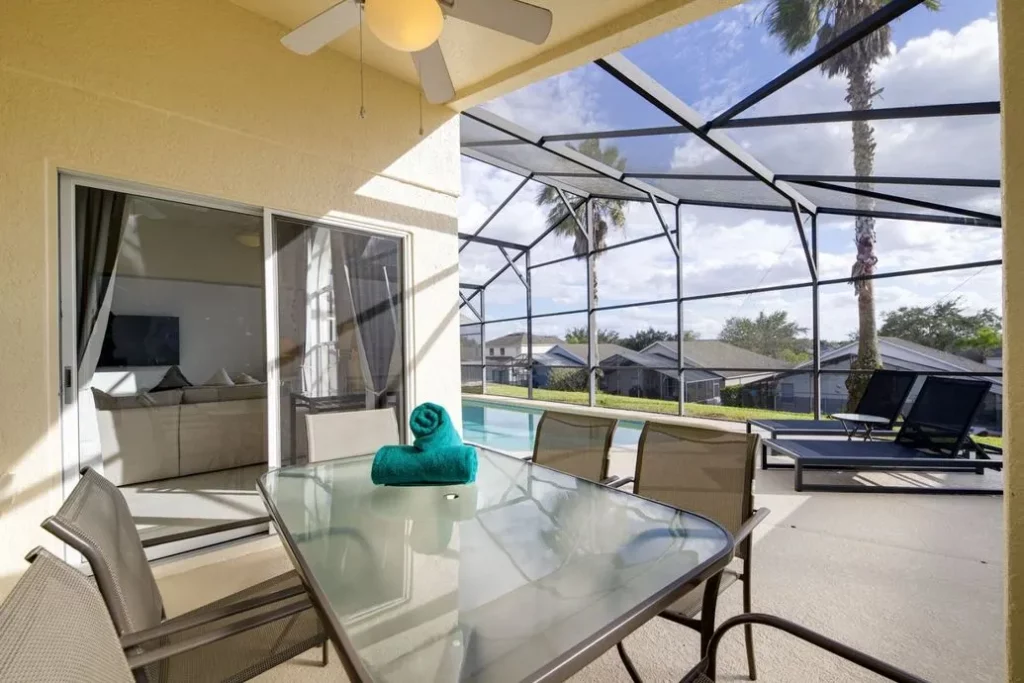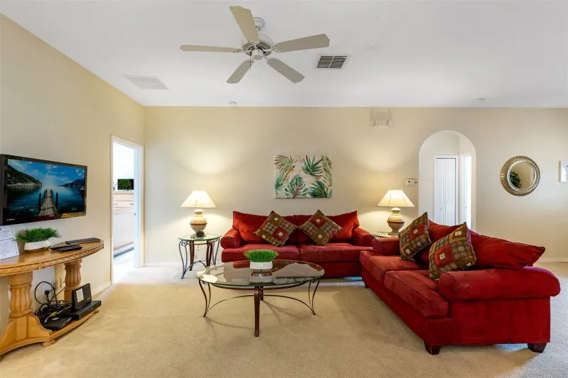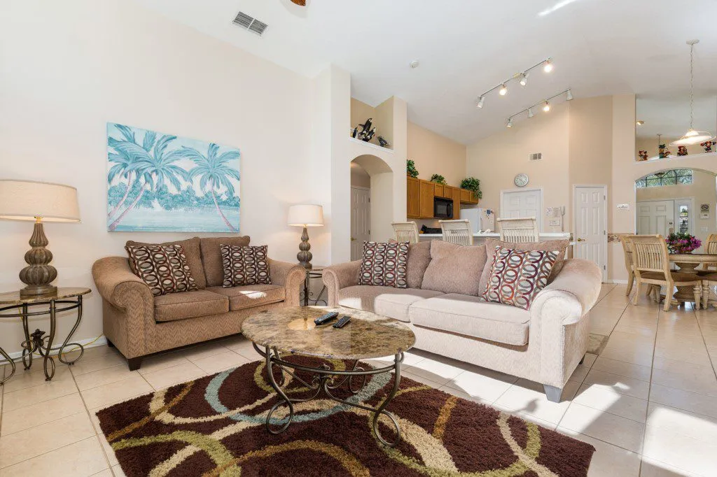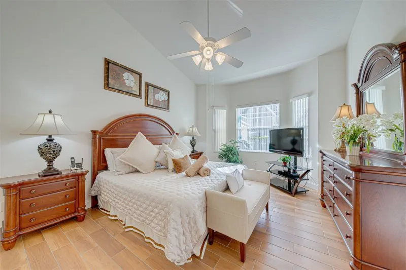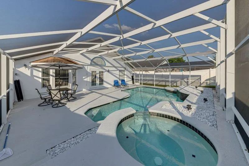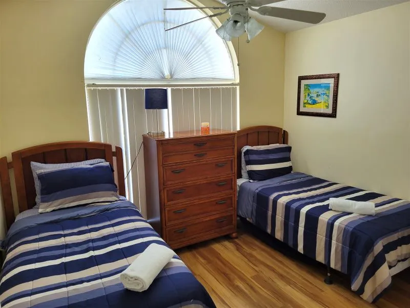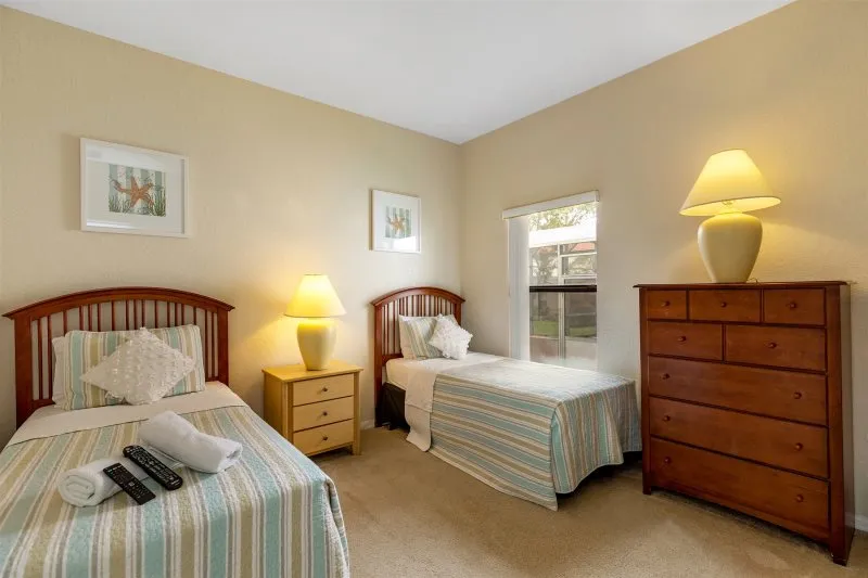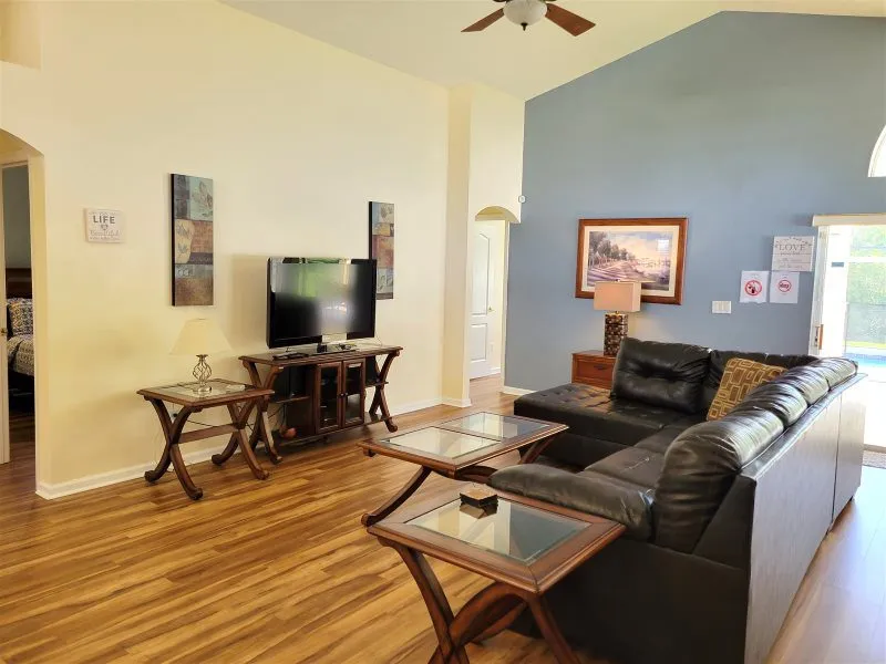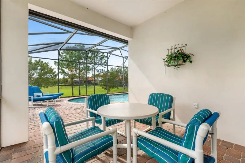 This Mediterranean-style villa is located in the gated community of Tuscan Hills, Davenport, which also has on-site facilities including a clubhouse, gym, games room, childrens’ play area and tennis and volleyball courts. The accommodation is one one level and is tiled throughout. There are 3 bedrooms, one king bed with en-suite bathroom, one queen and one twin. Each bedroom has its own flat screen TV.The entrance opens to an open plan floor space with a lounge and dining area, both of which have a door to the pool deck. There is a fully equipped kitchen and a utility cupboard with a washer and dryer. Complimentary Wi-Fi is provided. The pool is quite secluded as there are privacy hedges either side. A BBQ is available for a fee and there is a pool safety fence. Bed Configuration Bedroom 1: King size bed, TV, en-suite shower room Bedroom 2: Queen size bed, TV Bedroom 3: Twin beds, TV Family bathroom More Information There is an additional optional charge to heat the pool.