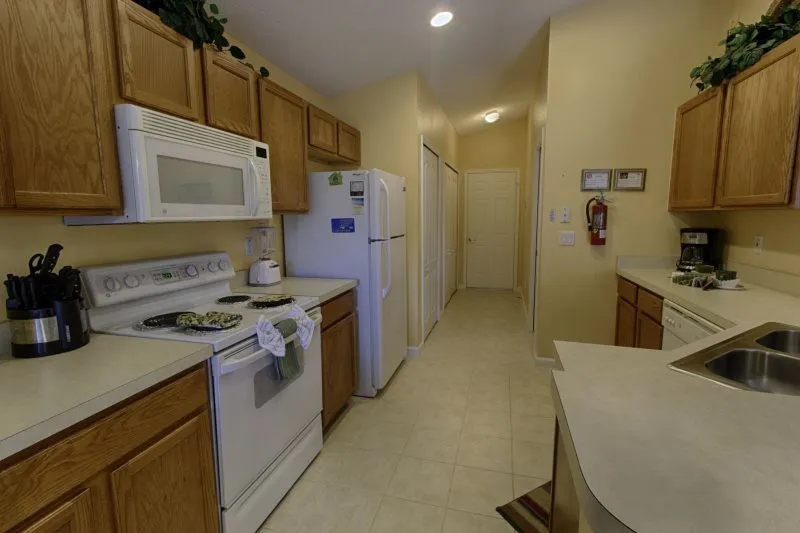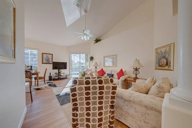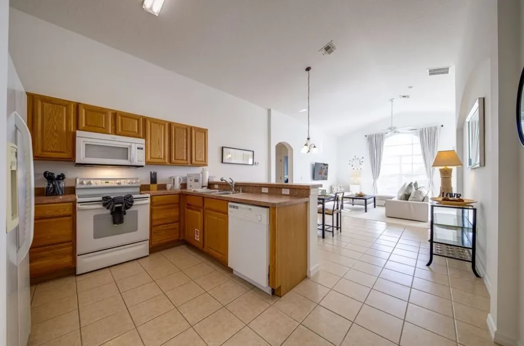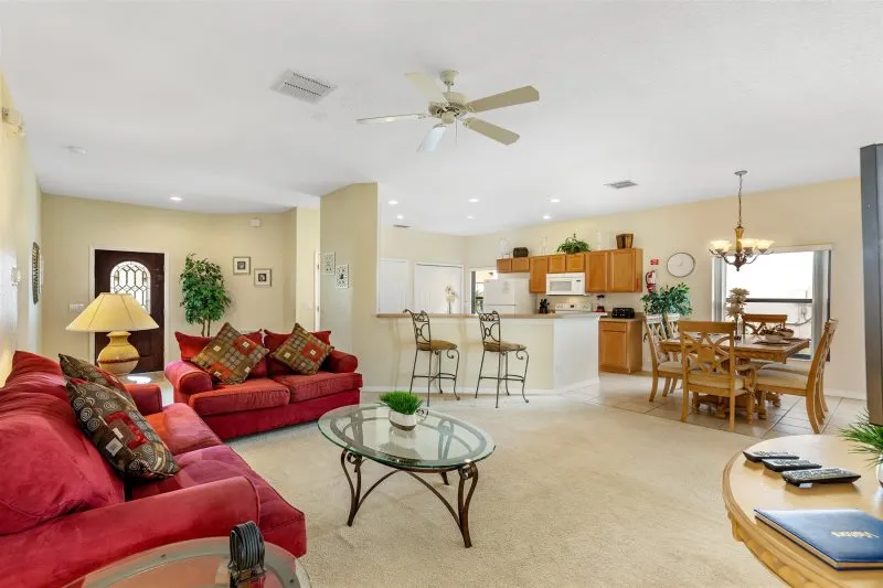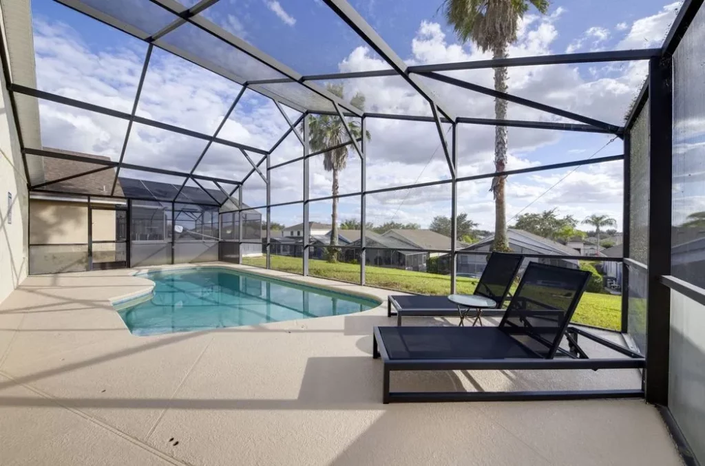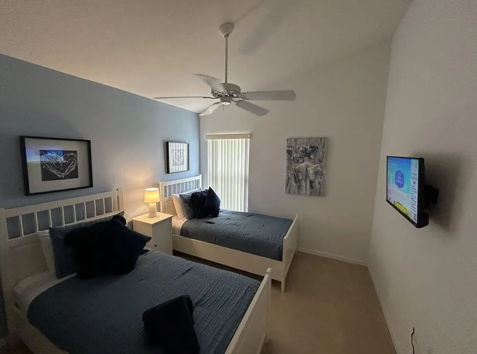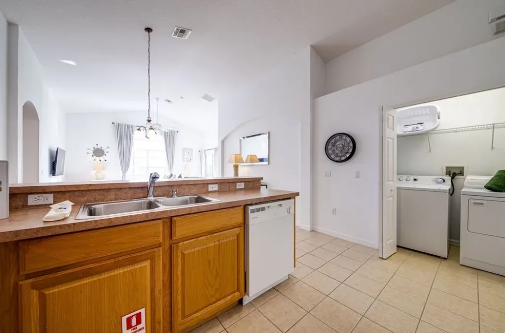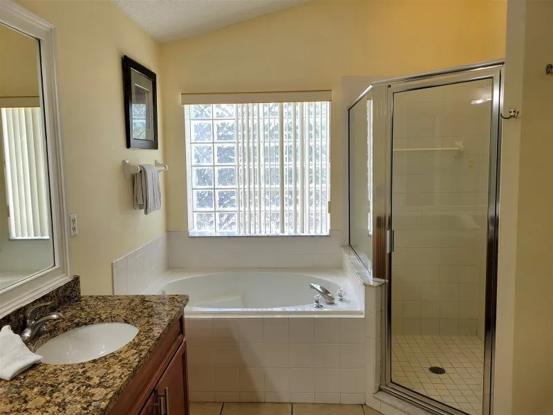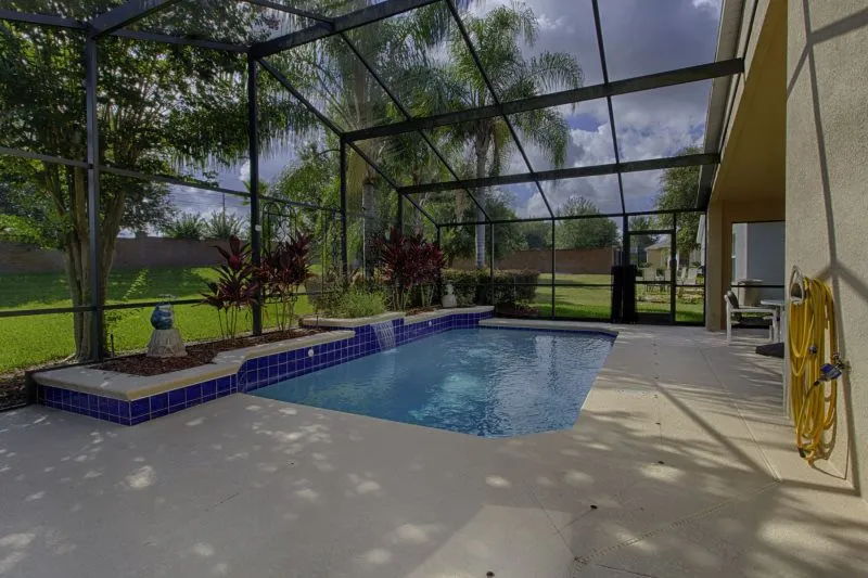 This Mediterranean-style villa is located in the gated community of Tuscan Hills, Davenport, which also has on-site facilities including a clubhouse, gym, games room, childrens’ play area and tennis and volleyball courts. The accommodation is one one level and is tiled throughout. There are 3 bedrooms, one king bed with en-suite bathroom, one queen and one twin. Each bedroom has its own flat screen TV.The entrance opens to an open plan floor space with a lounge and dining area, both of which have a door to the pool deck. There is a fully equipped kitchen and a utility cupboard with a washer and dryer. Complimentary Wi-Fi is provided. The pool is quite secluded as there are privacy hedges either side. A BBQ is available for a fee and there is a pool safety fence. Bed Configuration Bedroom 1: King size bed, TV, en-suite shower room Bedroom 2: Queen size bed, TV Bedroom 3: Twin beds, TV Family bathroom More Information There is an additional optional charge to heat the pool.