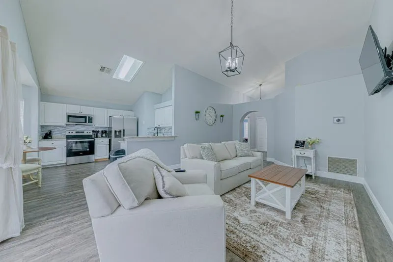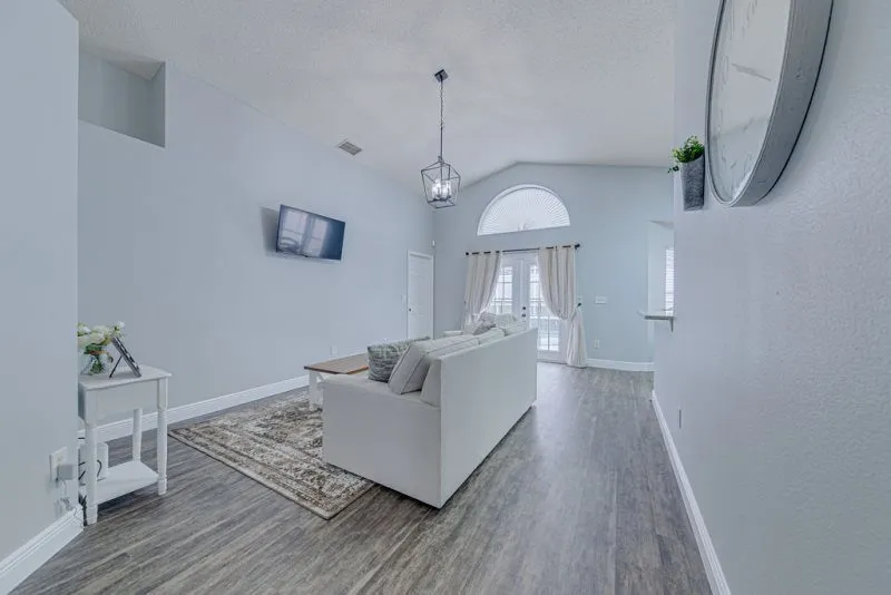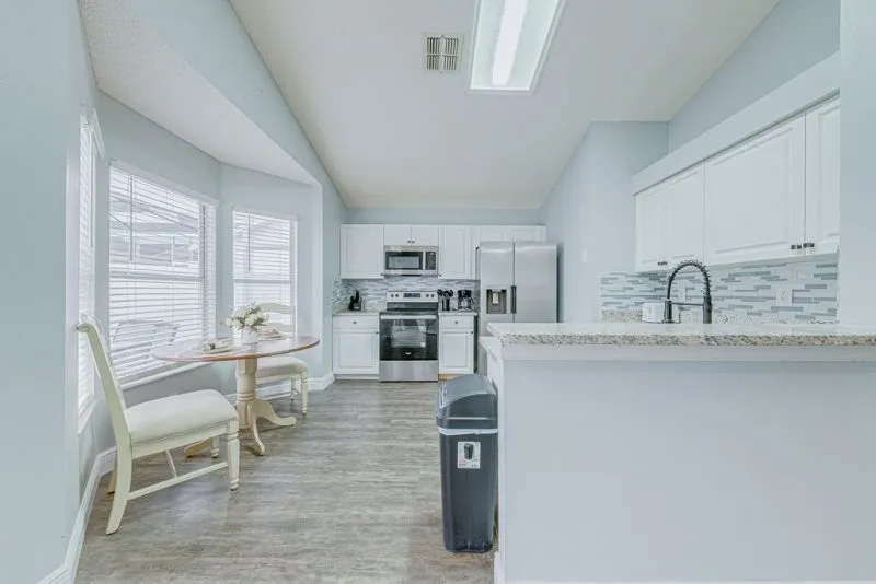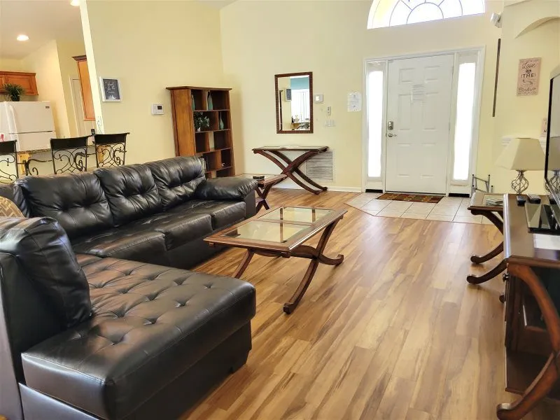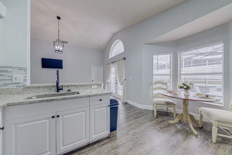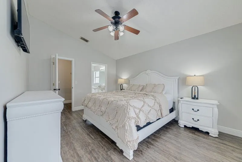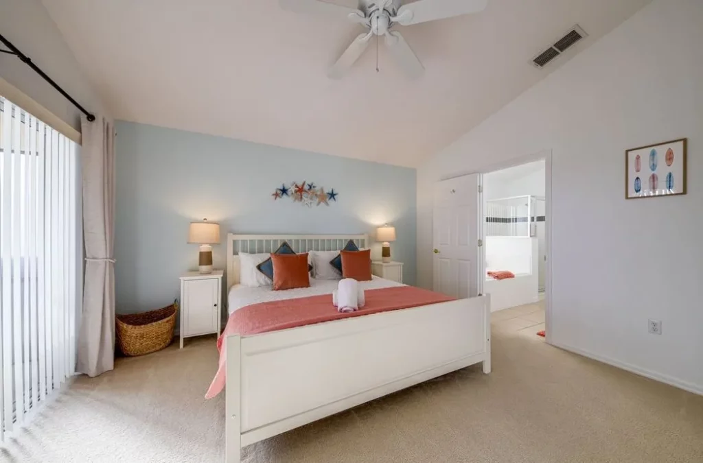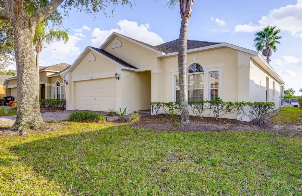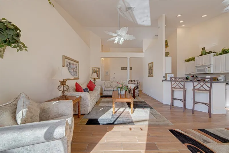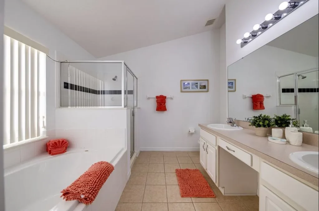 This Mediterranean-style villa is located in the gated community of Tuscan Hills, Davenport, which also has on-site facilities including a clubhouse, gym, games room, childrens’ play area and tennis and volleyball courts. The accommodation is one one level and is tiled throughout. There are 3 bedrooms, one king bed with en-suite bathroom, one queen and one twin. Each bedroom has its own flat screen TV.The entrance opens to an open plan floor space with a lounge and dining area, both of which have a door to the pool deck. There is a fully equipped kitchen and a utility cupboard with a washer and dryer. Complimentary Wi-Fi is provided. The pool is quite secluded as there are privacy hedges either side. A BBQ is available for a fee and there is a pool safety fence. Bed Configuration Bedroom 1: King size bed, TV, en-suite shower room Bedroom 2: Queen size bed, TV Bedroom 3: Twin beds, TV Family bathroom More Information There is an additional optional charge to heat the pool.