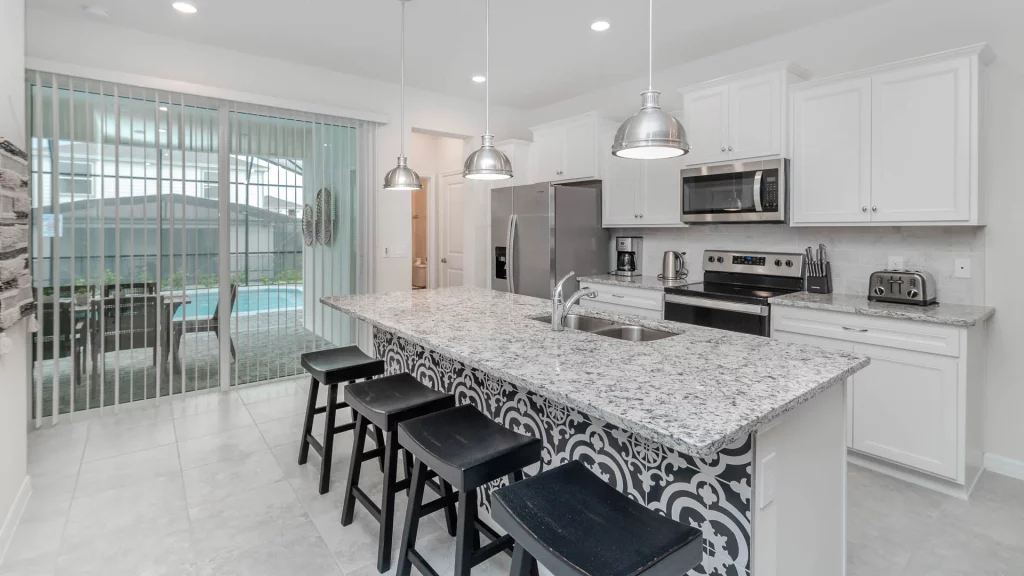 This beautiful home is located at Windsor Island in Kissimmee, just 9 miles from Disney. One of the newest villa resorts to be built recently, guests staying here have use of the communal facilities which include: 24/7 Security Gated 6500 sq. ft. Resort Style Swimming Pool 20 ft. Dual Waterslides Massive Pool Deck Lazy River Kids Splash Zone Full-Service Bar and Restaurant Cabanas Fitness Center Game Room Firepit with views of Fireworks Basketball Court Sand Volleyball Court Soccer Field 9-Holes of Mini Golf The villa is on two levels and has one master bedroom downstairs. The front door opens directly to the living area, dining table and a fully equipped kitchen with a breakfast bar and a door to the pool. Off the kitchen is a downstairs cloakroom with a door to the pool. The remaining bedrooms are upstairs as well as a second living area with 2 cinema style seats, bean bags and a wall mounted TV. The garage has been converted into a games room with an air hockey table and a TV. The pool has a Spa which can only be heated to the same temperature as the pool, when pool heating is added. There is a...
